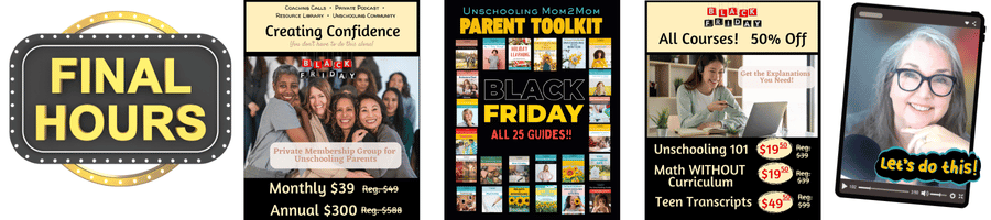 💛 Courses — 50% off • Unschooling 101 $19.50 (normally $39) • Learning Math Without Curriculum. $ 19.50 (normally $39) • Unschooling Teens: Transcripts $49 (normally $99)